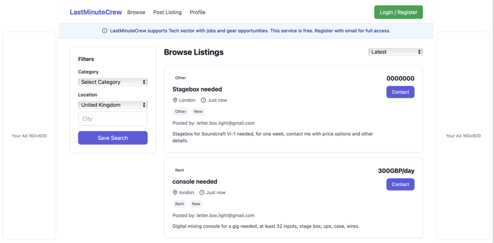 Key Features 🔐 Firebase Email Authentication Full login, registration, verification, and password reset flow. Secure Firebase config built into the script (ready to replace with your keys). Email verification required for posting and admin access. 👥 User Profile System Upload profile photo (stored locally in browser). Save name, title, location, experience, skills, and bio. Option to include profile info in job listings. 📋 Job & Gear Listings Post and browse listings with categories, subcategories, rates, and descriptions. 10 main categories (Staff, Gigs, Musicians, IT Services, Gear Board, etc.). Includes demo data + ability to add user-generated listings stored in LocalStorage. Listings can be searched, sorted, and deleted locally. 🧰 Admin Panel Toggle ads visibility. Ban/unban users locally by email. Search and remove listings for moderation. Admin login limited to verified addresses listed in ADMIN_EMAILS. 💬 User Interaction “Contact” button opens pre-filled email message (no in-site messaging). Safe email-only contact system to avoid spam. 🧾 Legal Pages (Modal-based) Built-in modals for: Terms & Conditions Privacy Policy Cookie Policy Acceptable Use FAQs Each modal is accessible from the footer — no external navigation required. 🧱 Frontend & Layout Built with Tailwind CSS for modern, responsive UI. Adaptive layout for desktop, tablet, and mobile. Mobile bottom nav & sticky ad placement for smaller screens. Uses Lucide icons for consistent lightweight icons. Theme automatically adjusts to dark mode on desktop. 💡 Advertising-Ready Pre-defined ad slots (160×600 rails and 320×50 mobile sticky). Controlled by admin toggle — great for future monetization. ⚡ Performance Loads instantly — pure HTML, CSS, and JS (no frameworks or build tools). Lightweight scripts and optimized Tailwind configuration. Fully functional offline (data stays locally). 🧩 Tech Stack HTML5 + Tailwind CSS (CDN) Firebase Authentication (Compat) Lucide Icons (CDN) LocalStorage for data persistence No backend, no hosting dependency 🪄 Perfect For Indie developers wanting a starter SaaS or listing app boilerplate. Agencies creating job/gig boards for clients. Creators who need a zero-backend app to host anywhere (Firebase Hosting, Netlify, GitHub Pages). Students learning how to integrate Firebase Auth without frameworks. 📦 Included Files index.html — full working app Documentation (setup & customization guide) License & support info 🏷️ Example Product Title for Gumroad or Codester No-Backend Job Board Template – Tailwind CSS + Firebase Auth Short tagline: Build your own job or gig marketplace — fully functional, no backend or database required.